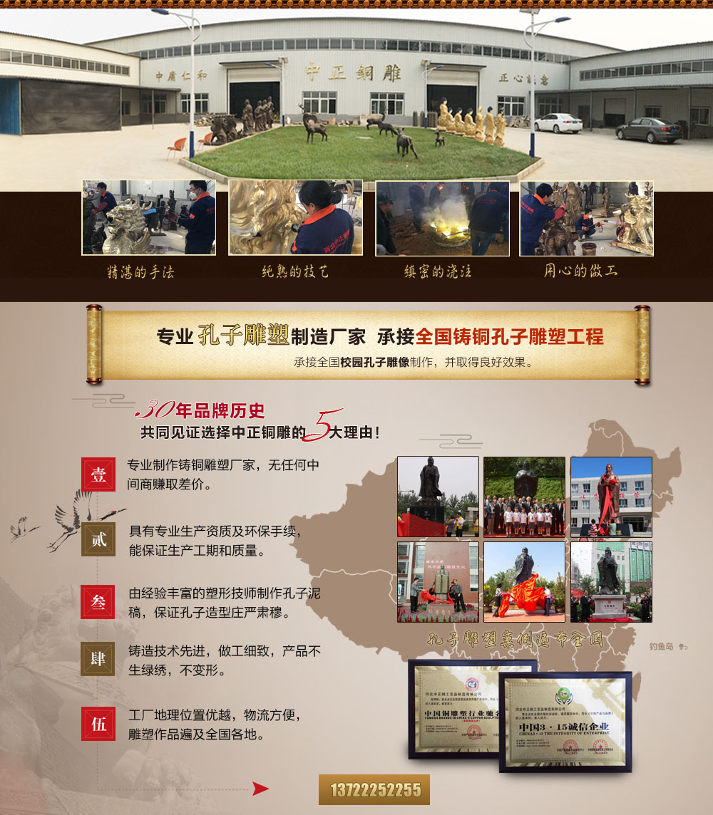 河北中正銅工藝品制造有限公司是一家具有獨立設計、雕塑、鑄造、制作施工能力的單位。擁有完善的,大型的,先進的生產設備,并由多位經驗豐富的高級鑄造技師指導生產及制作。公司主要鑄造銅關公,九龍銅關公,福建銅關公,臺灣銅關公,關羽雕塑,鑄銅關公,銅雕關公,1米銅關公,2米銅關公等,可按客戶提供動物銅雕圖片訂做加工銅關公,九龍銅關公,做工精美,質量保證。